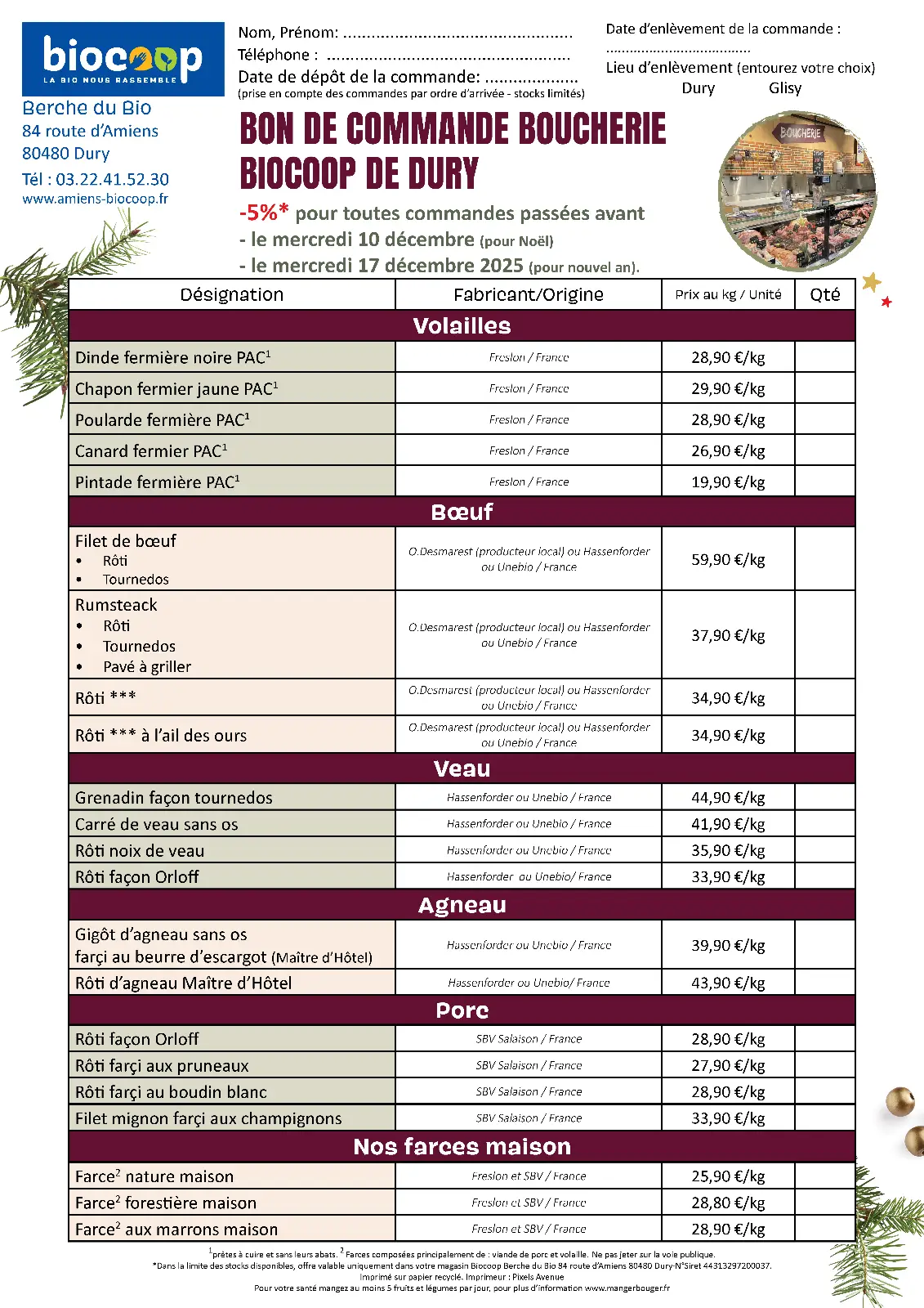 -un bon de commande pour la boucherie de notre magasin Biocoop Berche du bio à Dury ou vous trouverez vos volailles, préparations bouchères, farces maison etc. Il est possible de retirer vos commandes de la boucherie dans nos 2 magasins.