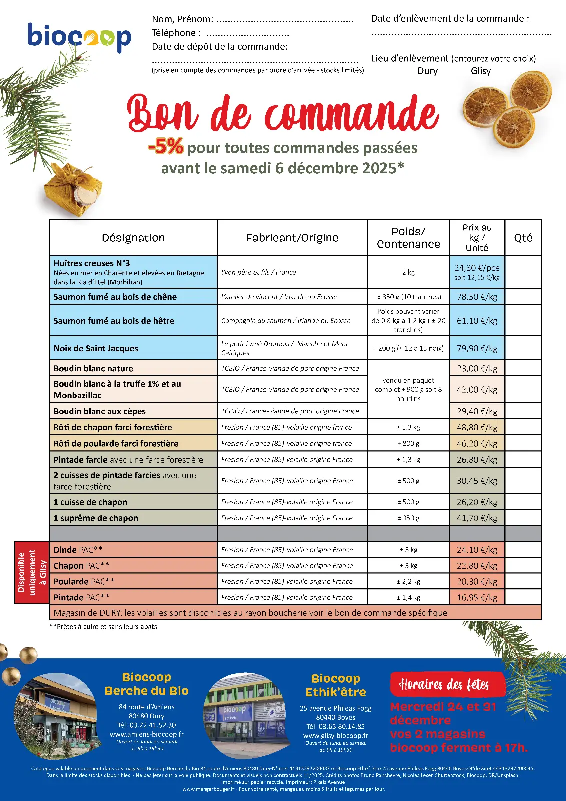 -un bon de commande valable pour les 2 magasins. Huitres, saumons, boudins, volailles,...sont à retrouver sur ce bon de commande.